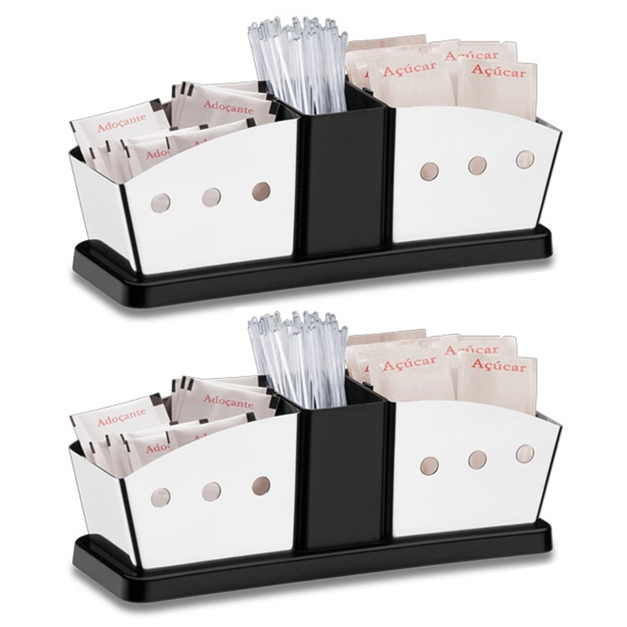 Divisórias: 3 compartimentos (2 laterais para sachês e 1 central para palitos/mexedores)
