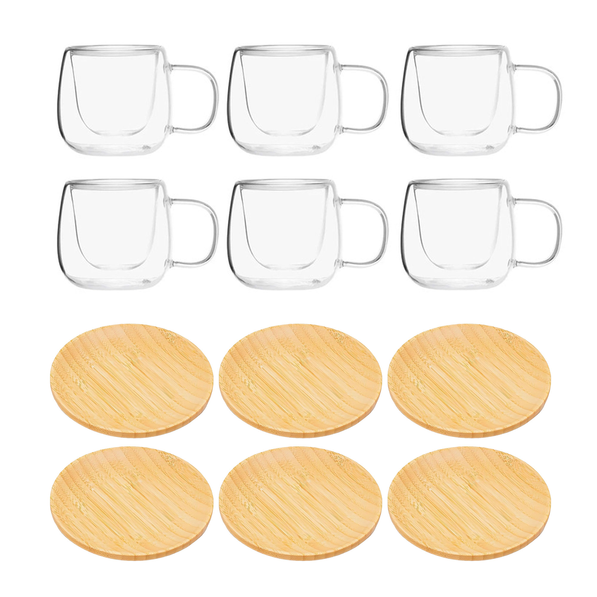 Kit 6 Xícaras Vidro Borossilicato + 6 Pratos Bambu Ecológico 11cm