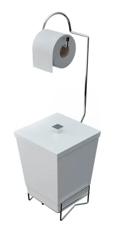 Suporte para 01 rolo de papel higiênico e lixeira com capacidade de 6,5 litros.