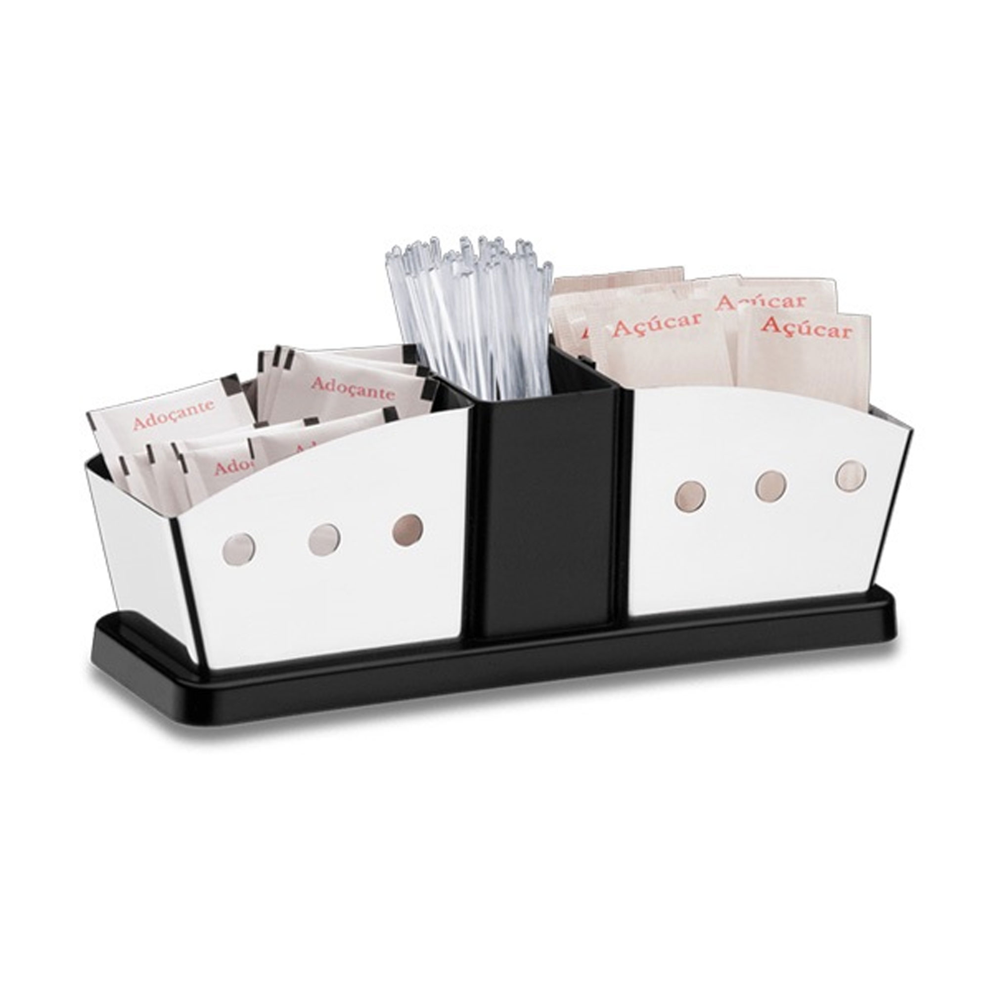 Divisórias: 3 compartimentos (2 laterais para sachês e 1 central para palitos/mexedores)