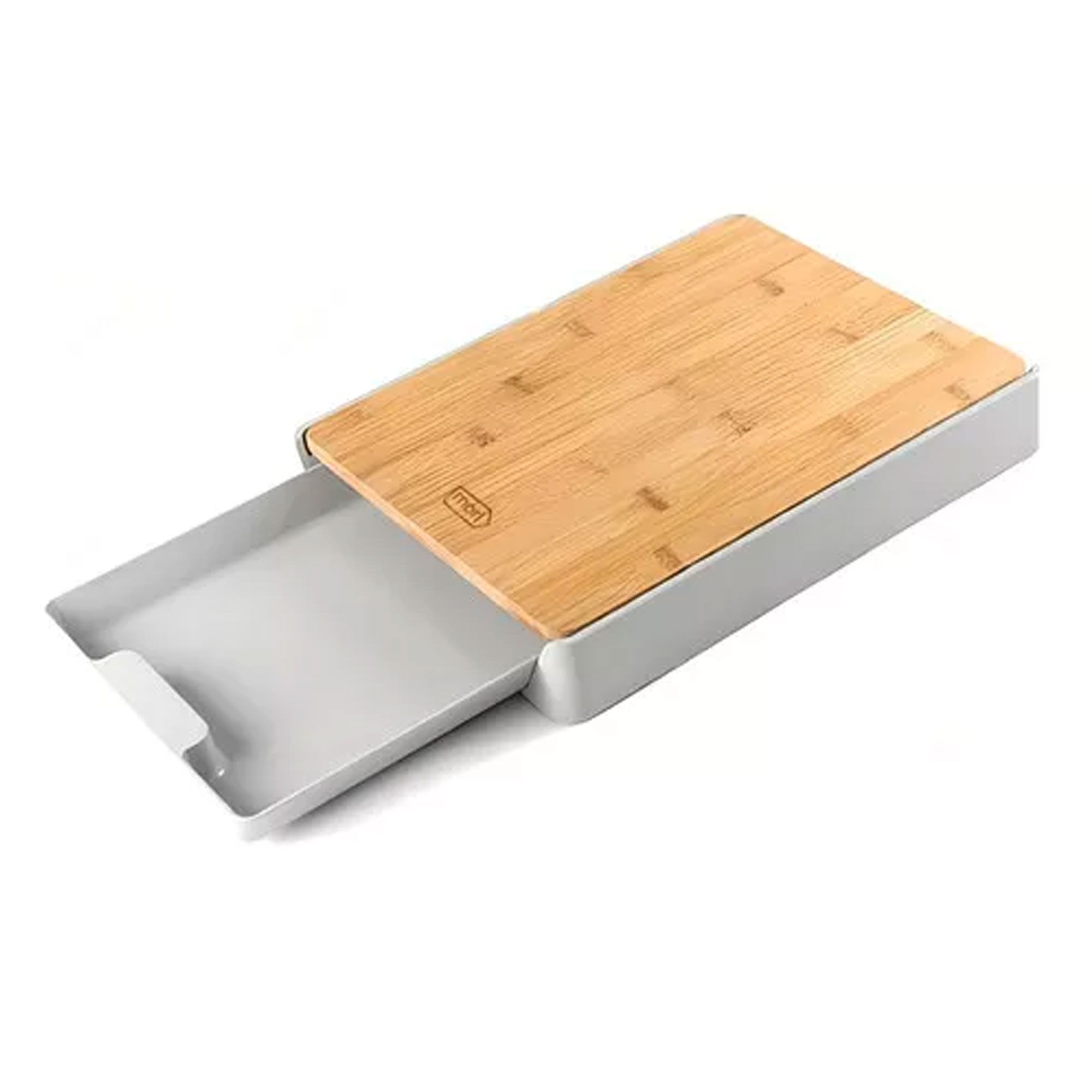 Bandeja integrada que facilita a coleta de resíduos ou a transferência de alimentos preparados, mantendo a área de trabalho limpa e organizada.